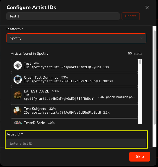You can also add or edit Artist IDs at any time from the Artists section by searching for the relevant artist and updating their IDs.